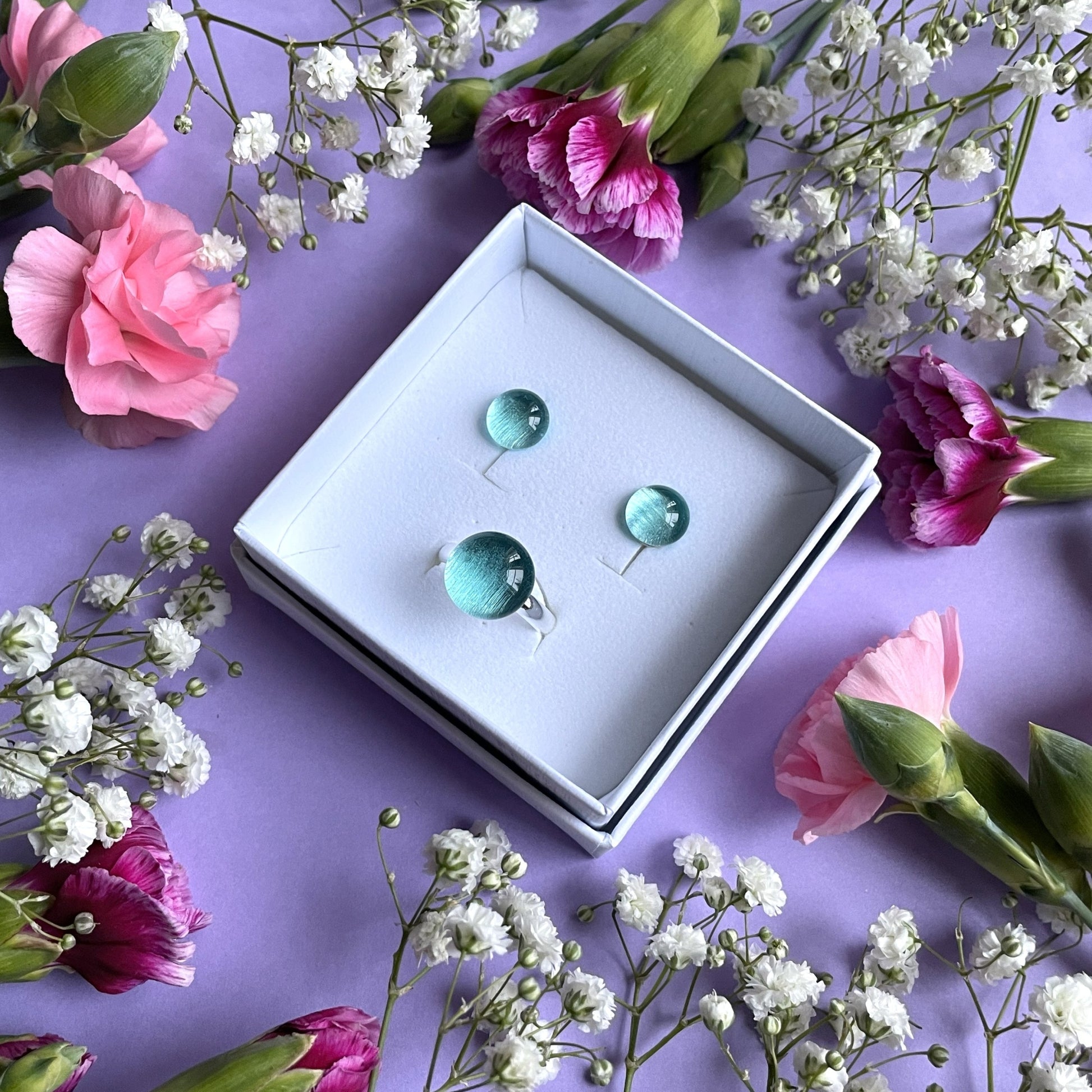 Minimalistinen ja ajaton setti, jossa on sulatetusta lasista valmistettu säädettävä NAMU-sormus sekä kauniit nappikorvakorut samaa sävyä. Metalliosat ovat nikkelitöntä 925 hopeaa.