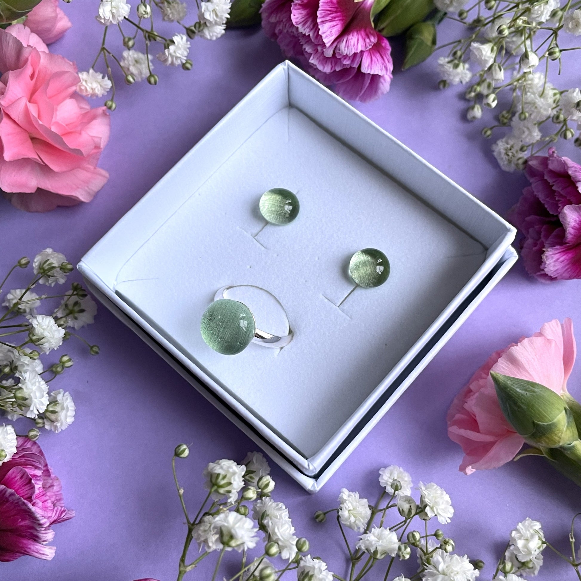 Minimalistinen ja ajaton setti, jossa on sulatetusta lasista valmistettu säädettävä NAMU-sormus sekä kauniit nappikorvakorut samaa sävyä. Metalliosat ovat nikkelitöntä 925 hopeaa.