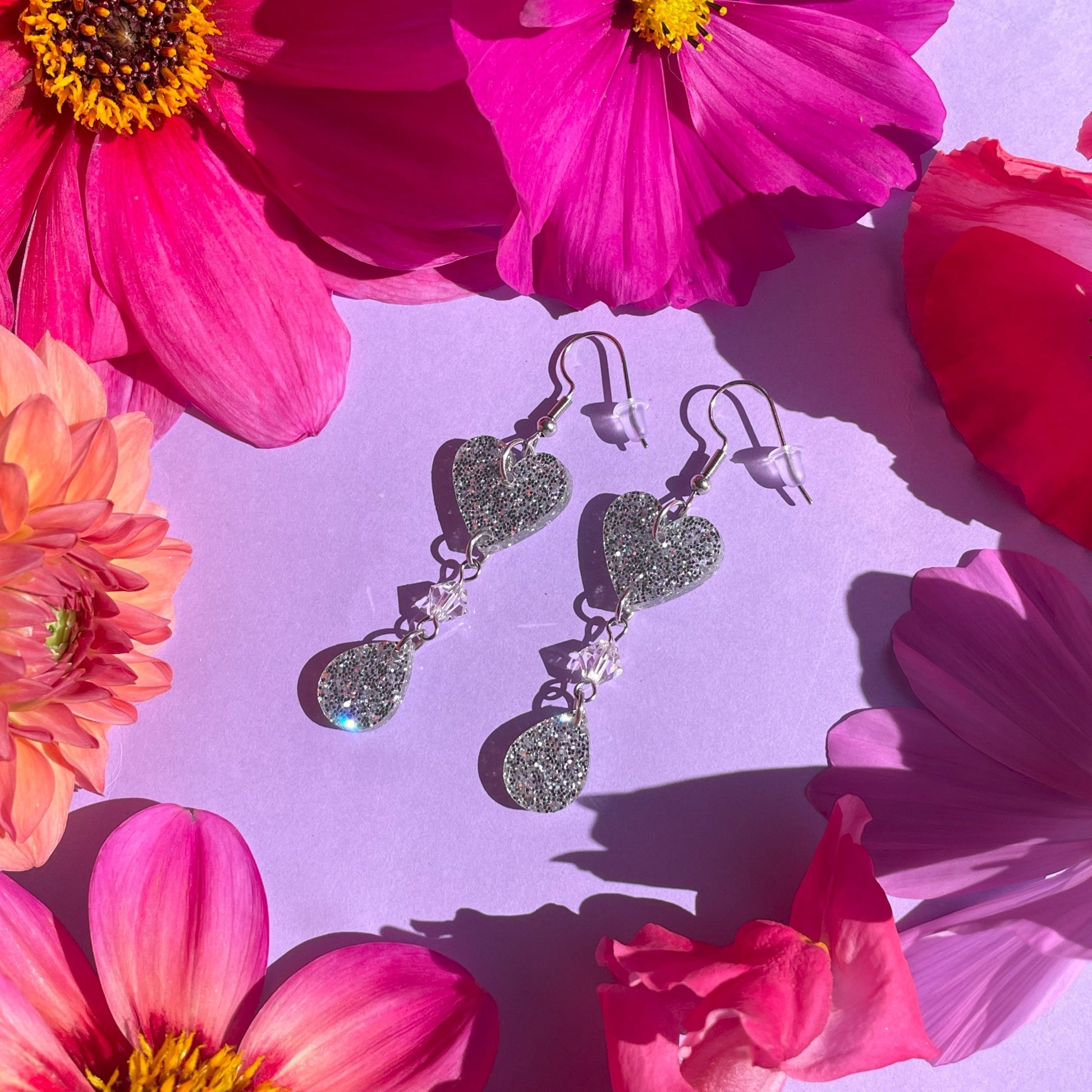 Raining Heart -korvakorut kristallilla, lyhyempi, hopea glitter
