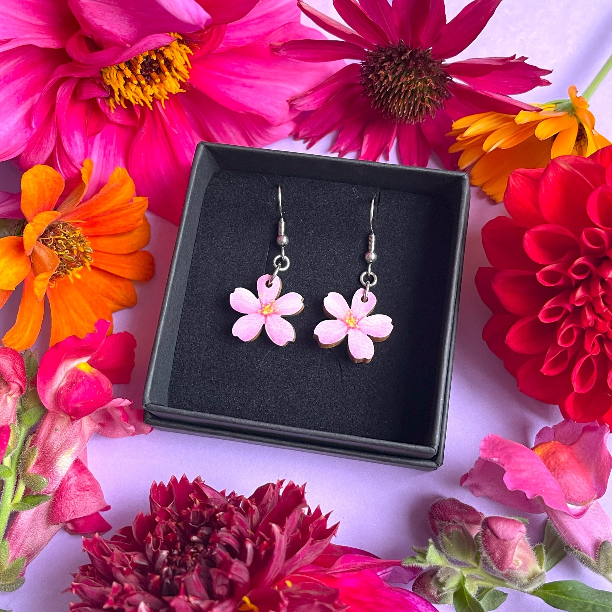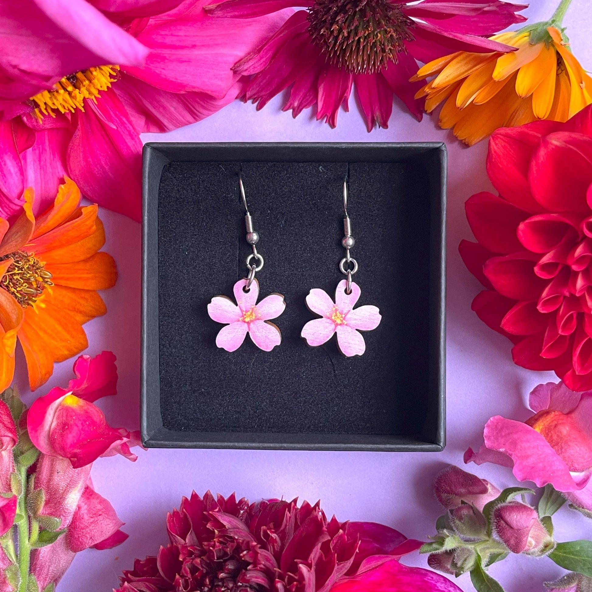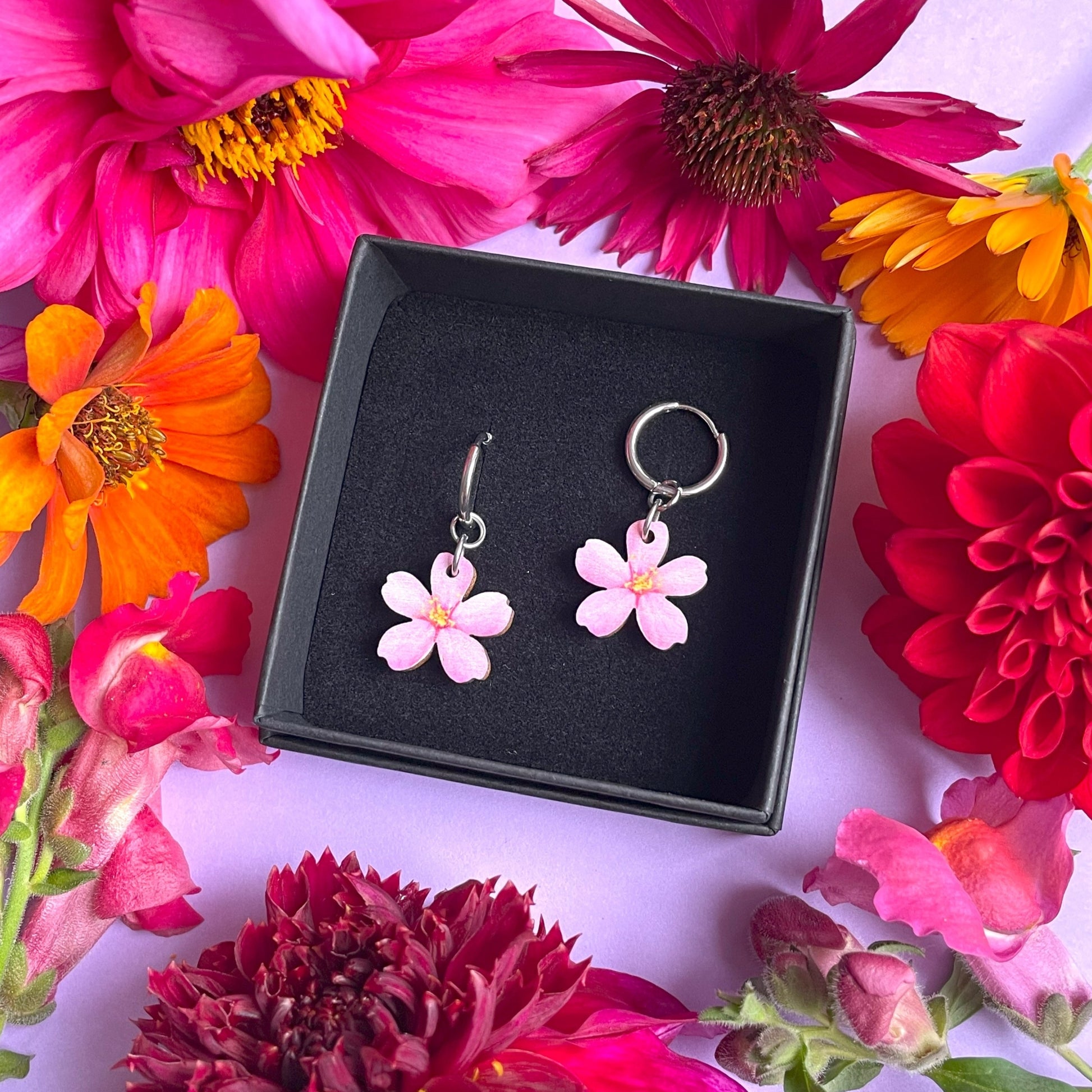 Suloiset pienet kirsikankukkakorvakorut! Näiden korvakorujen materiaali on suomalaista PEFC- ja FSC- sertifioitua koivuvaneria. Puuosat on laserleikattu ja printattu (printti molemmin puolin) Helsingissä ja viimeistelty Vantaalla. Metalliosat ovat kirurginterästä, joka ei tummu käytössä.