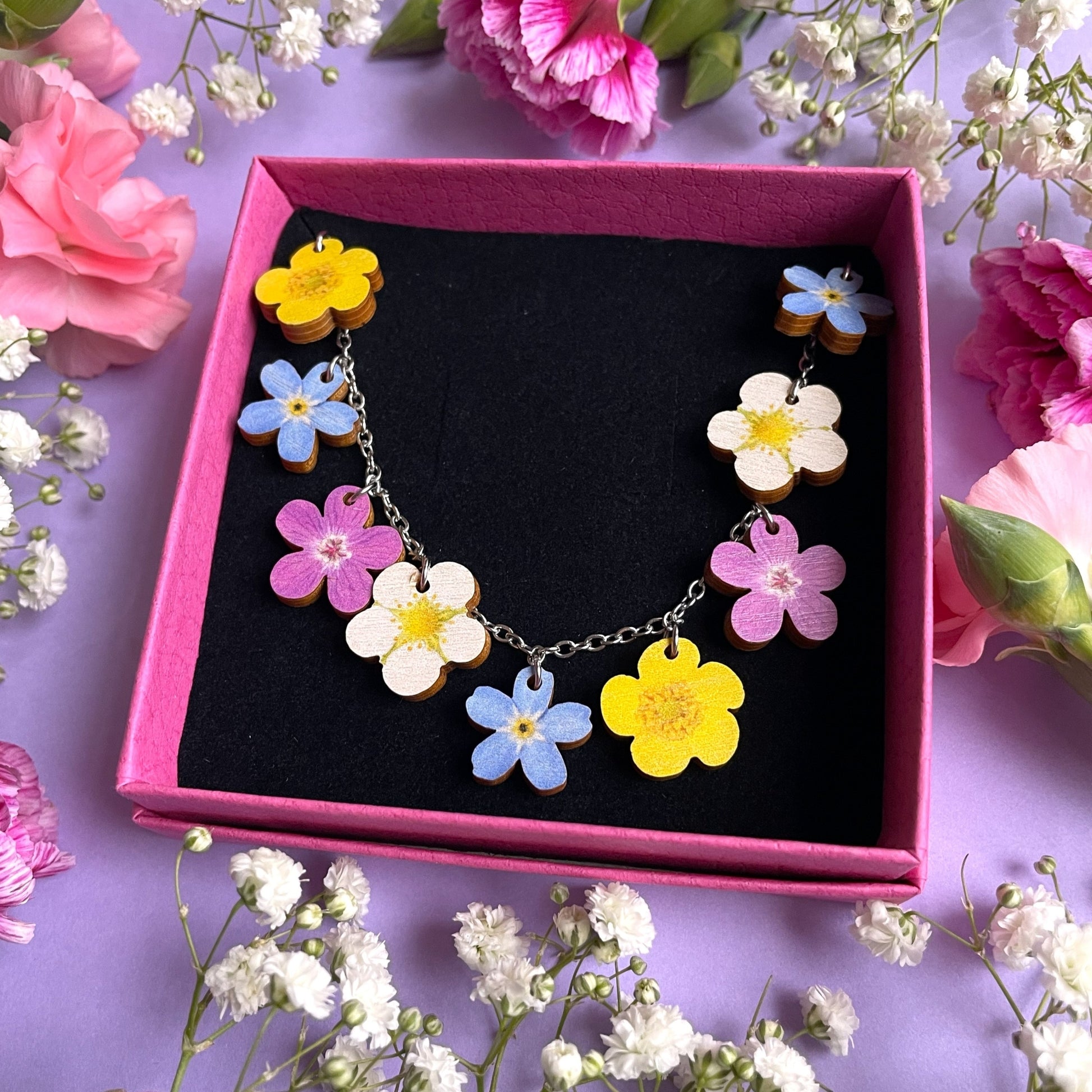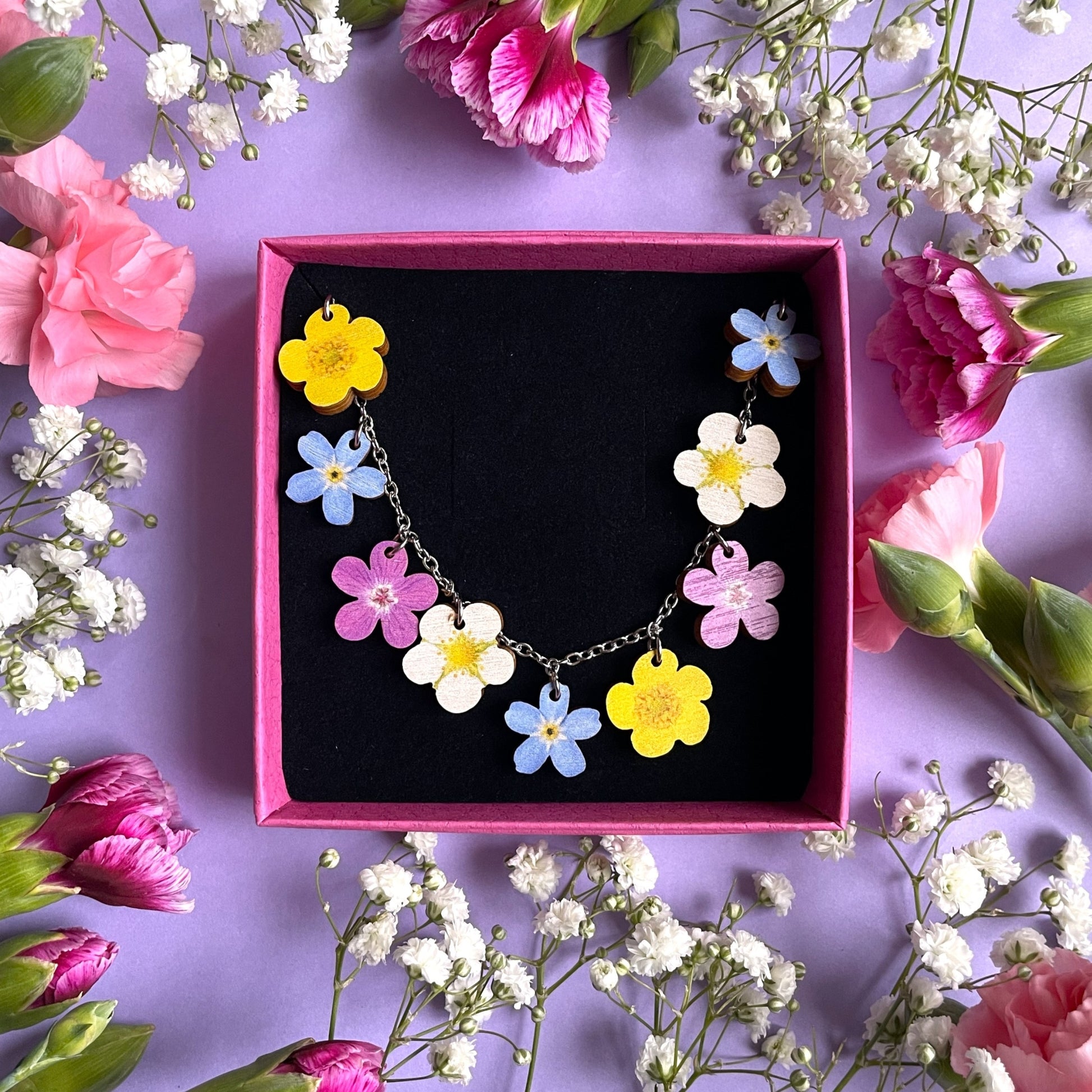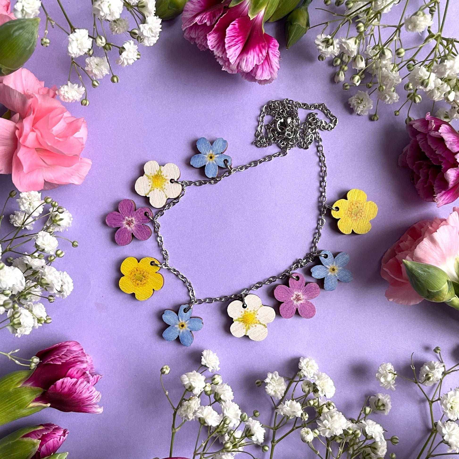 Tien vierustoilta ja kotinurmikoilta löytyvät alkukesän ihanat kukkaset ahomansikka, metsäkurjenpolvi, niittyleinikki ja lemmikki kukkivat läpi vuoden tässä suloisessa kaulakorussa.