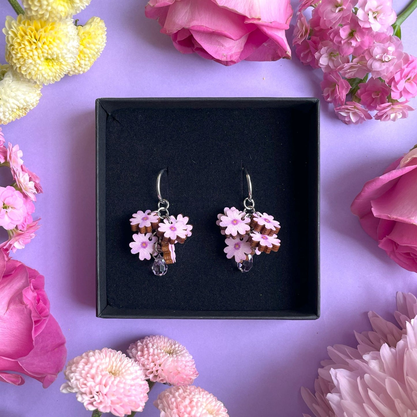 UUTUUS: Suloinen Leimunen! Leimunen-korvakorujen materiaalina on suomalainen PEFC- ja FSC- sertifioitu koivuvaneri sekä allergiaystävällinen kirurginteräs, joka ei tummu käytössä. Kukkaryppään alaosaa koristaa vaaleanpunainen kristallipisara. Puuosat on laserleikattu ja printattu (printti molemmin puolin) Helsingissä ja koottu muotoonsa Vantaalla. Korvakorujen pituus huggie-rengas mukaan laskettuna on yht. 4,5 cm. Korvakorut ovat todella kevyet ja ne toimitetaan korurasiassa.