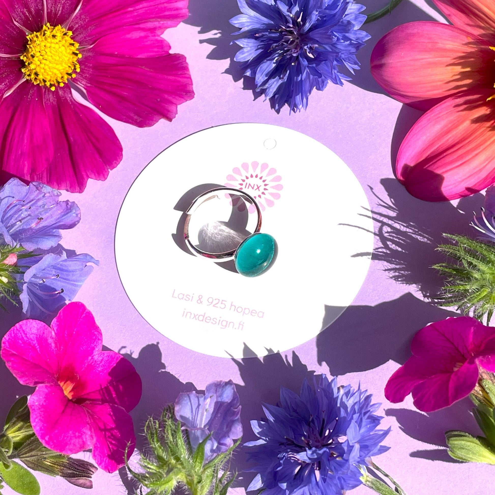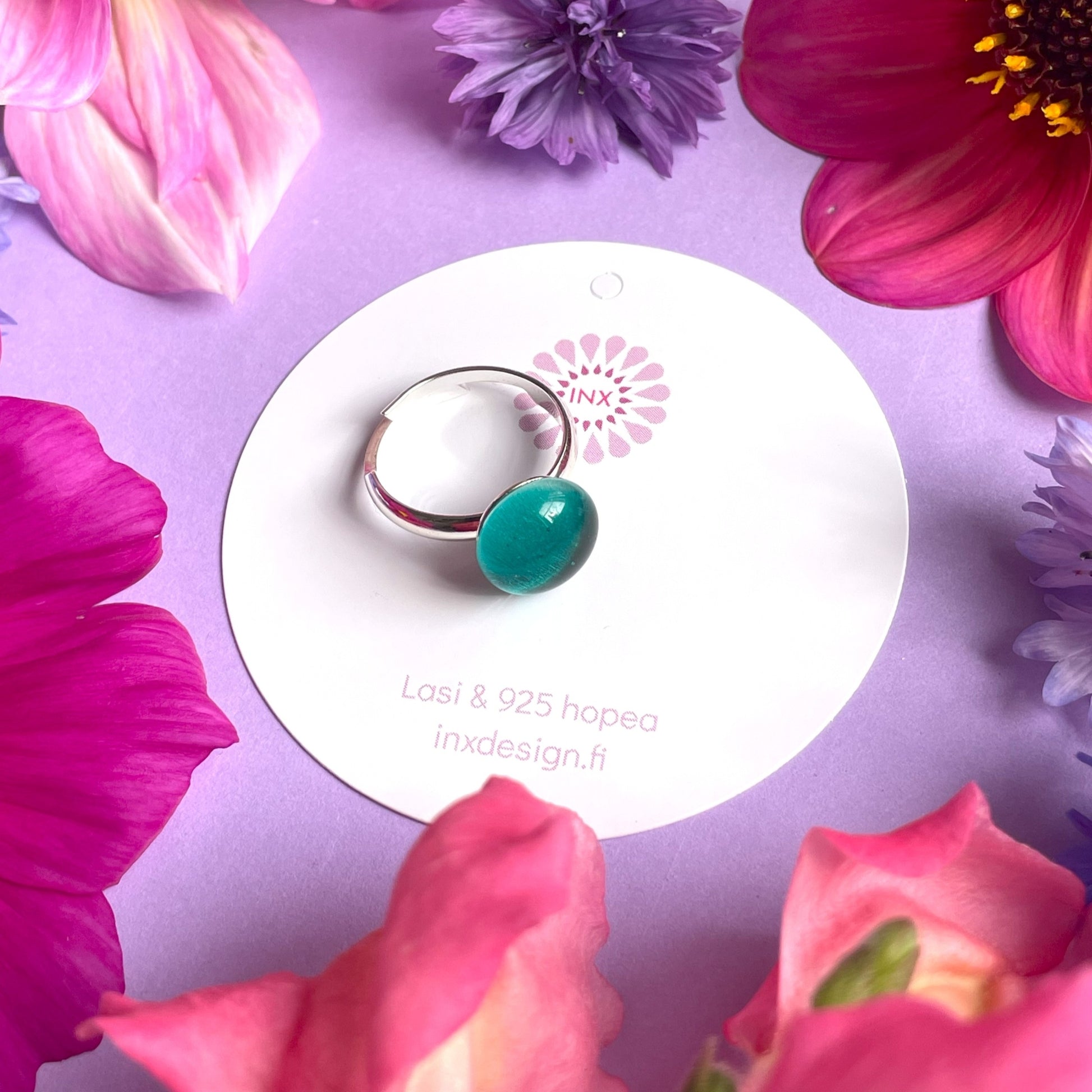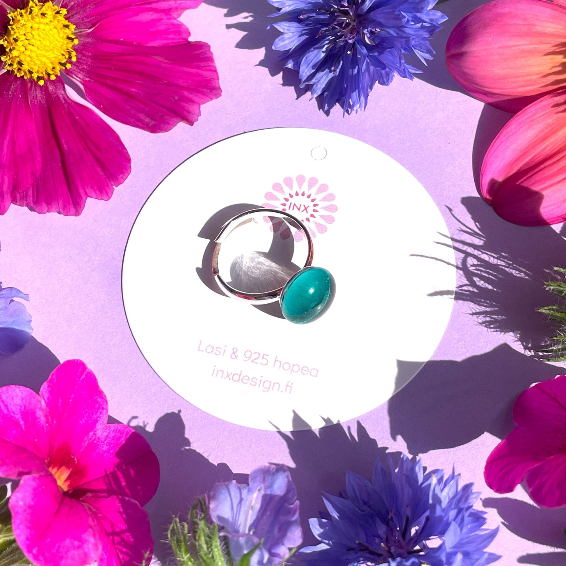 Inxin uutuussormus on todellinen namu! Se on siro ja tyylikäs, valonsäteet vangitseva herkkupala. Sormus valmistetaan lasista sulattamalla se yli 800 asteen lämmössä. Jokainen lasinpala on leikattu käsin, joten pieniä yksilöllisiä eroja voi olla. Lasiosan halkaisija on 1,1 cm. Sormusrunko on materiaaliltaan 925 hopeaa ja kooltaan säädettävä. Sovituskuvassa sävy peacock blue on oikeanpuoleinen sormus (vasemmalla puolella sävy petroli).