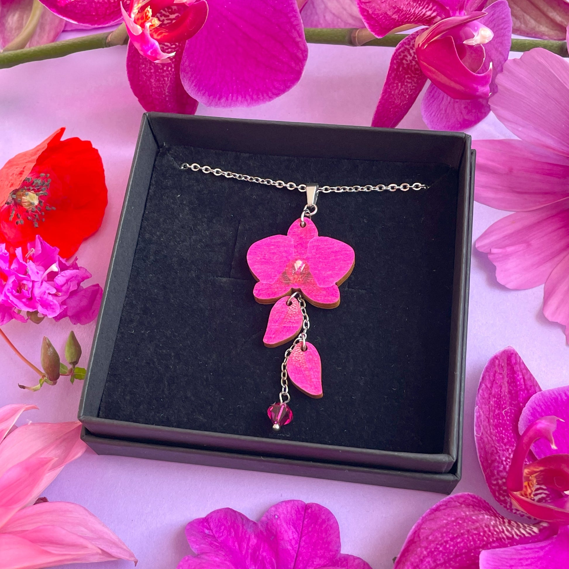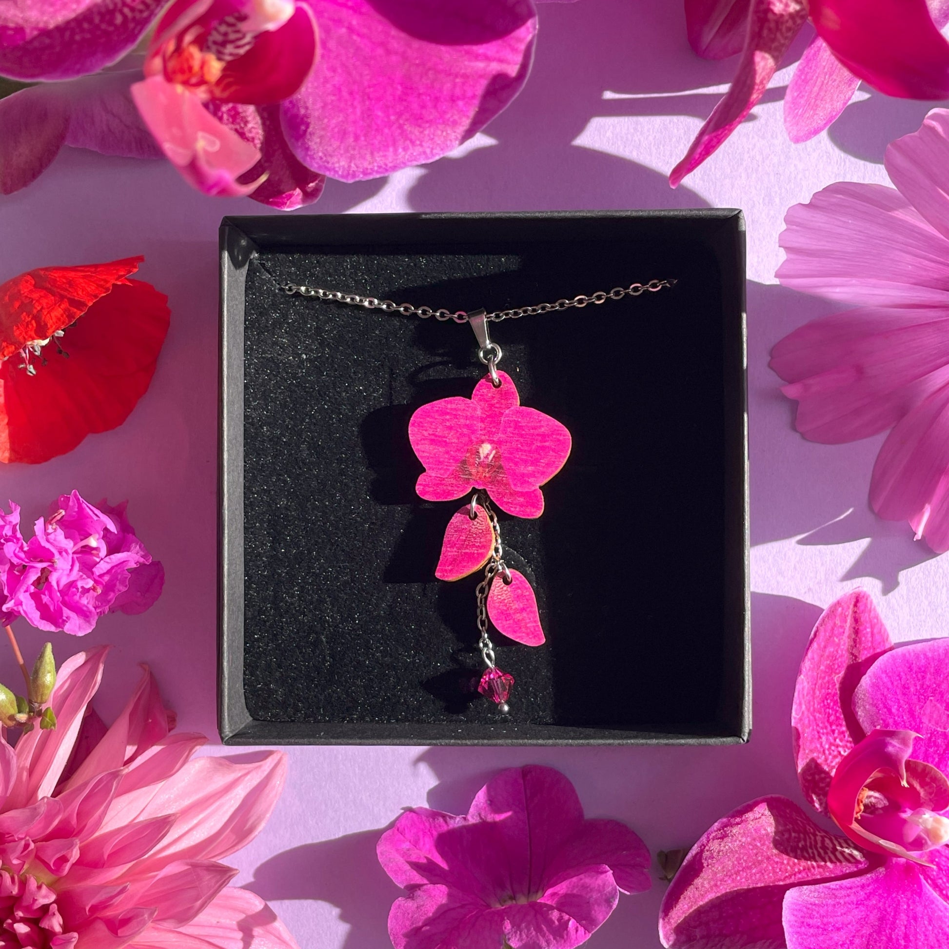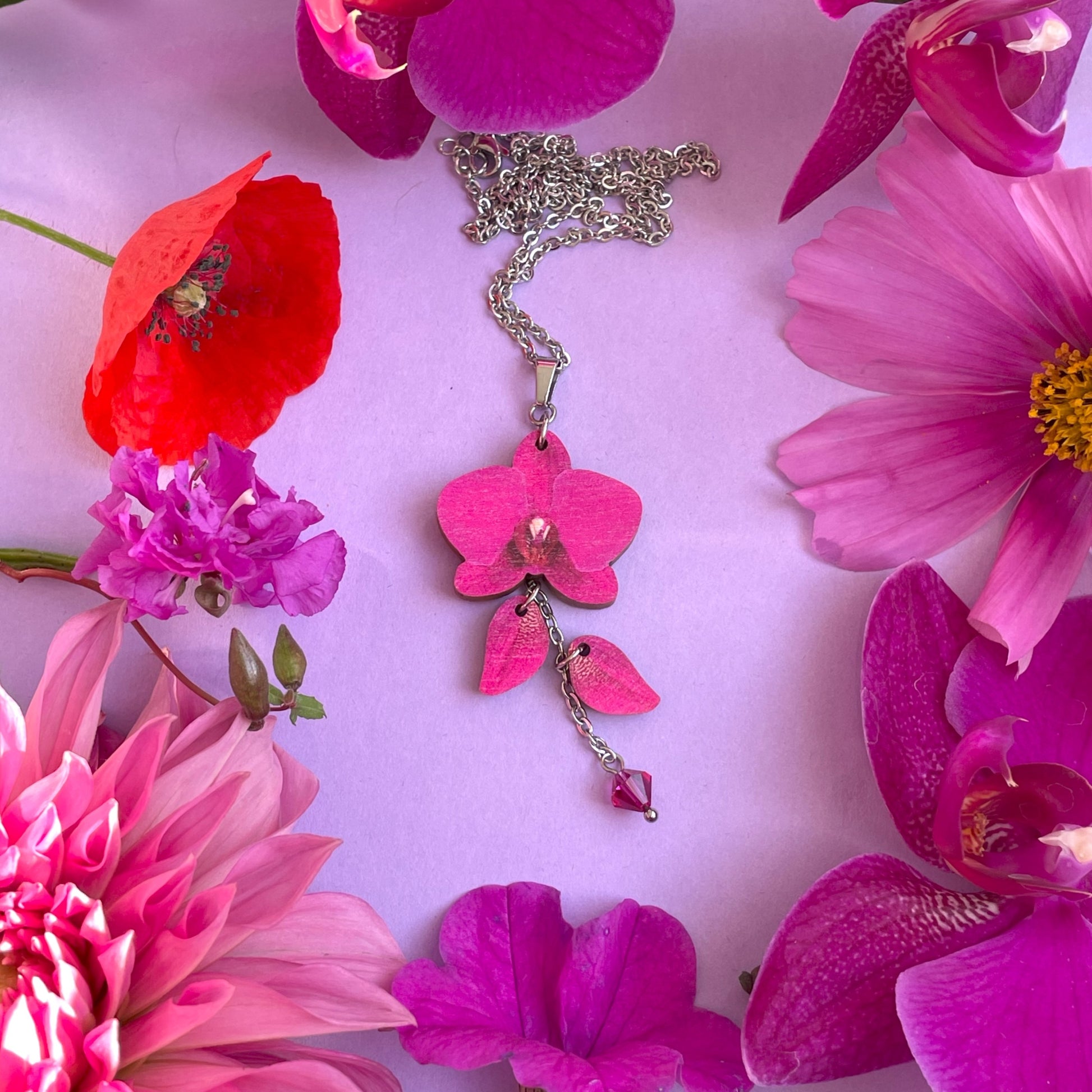 Tämä näyttävä fuksian värinen Orkidea-kaulakoru tuo ripauksen trooppista eleganssia arkeen ja juhlaan. Kaulakorun herkkä muotoilu ja intensiivinen väri tekevät niistä katseenvangitsijan, joka viimeistelee asusi ainutlaatuisella tavalla.