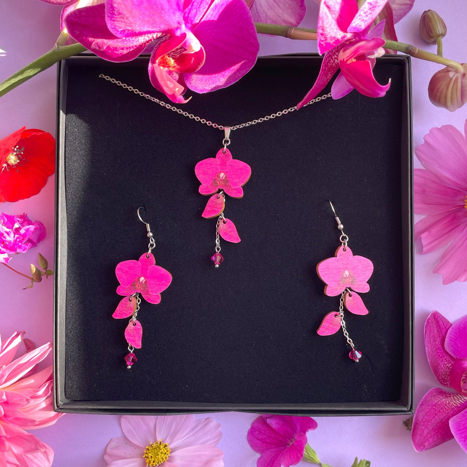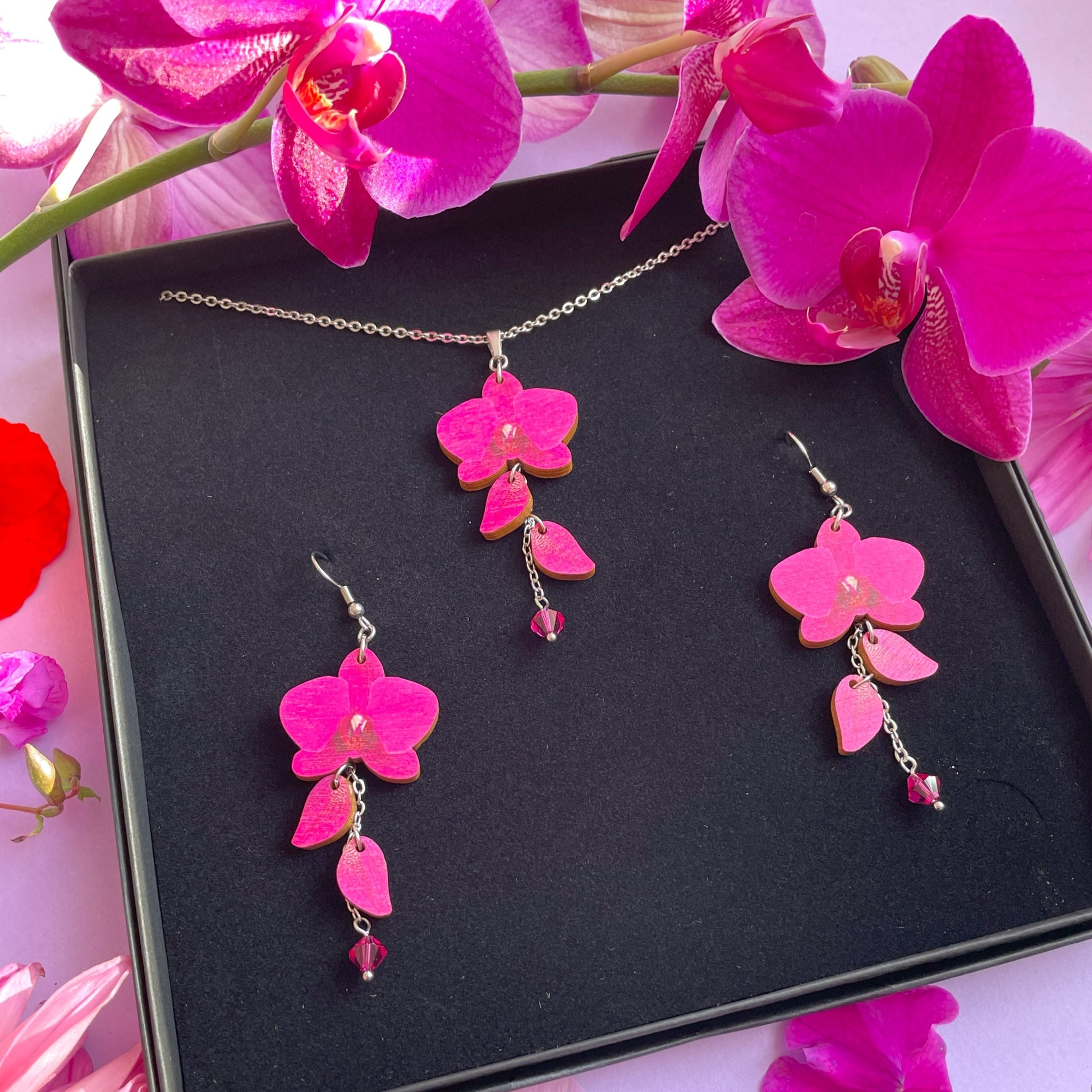 Kaulakorun ja korvakorut sisältävä Orkidea-setti, joka hurmaa!