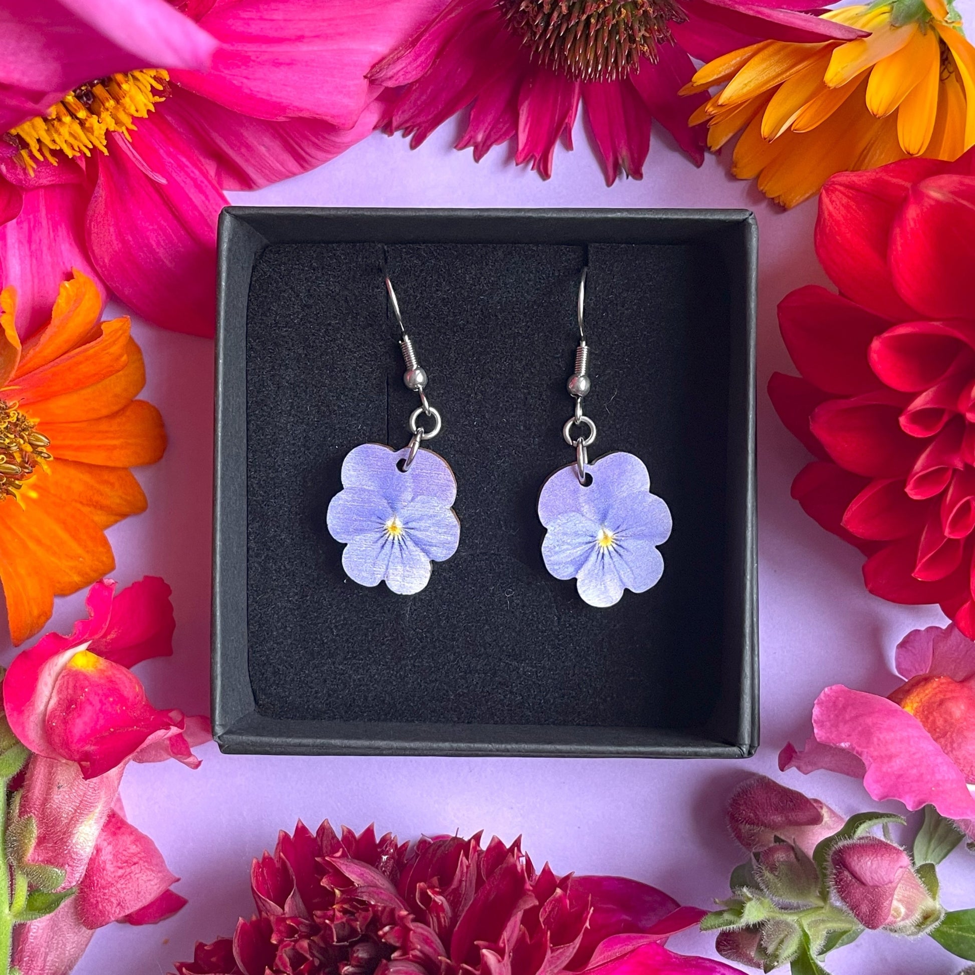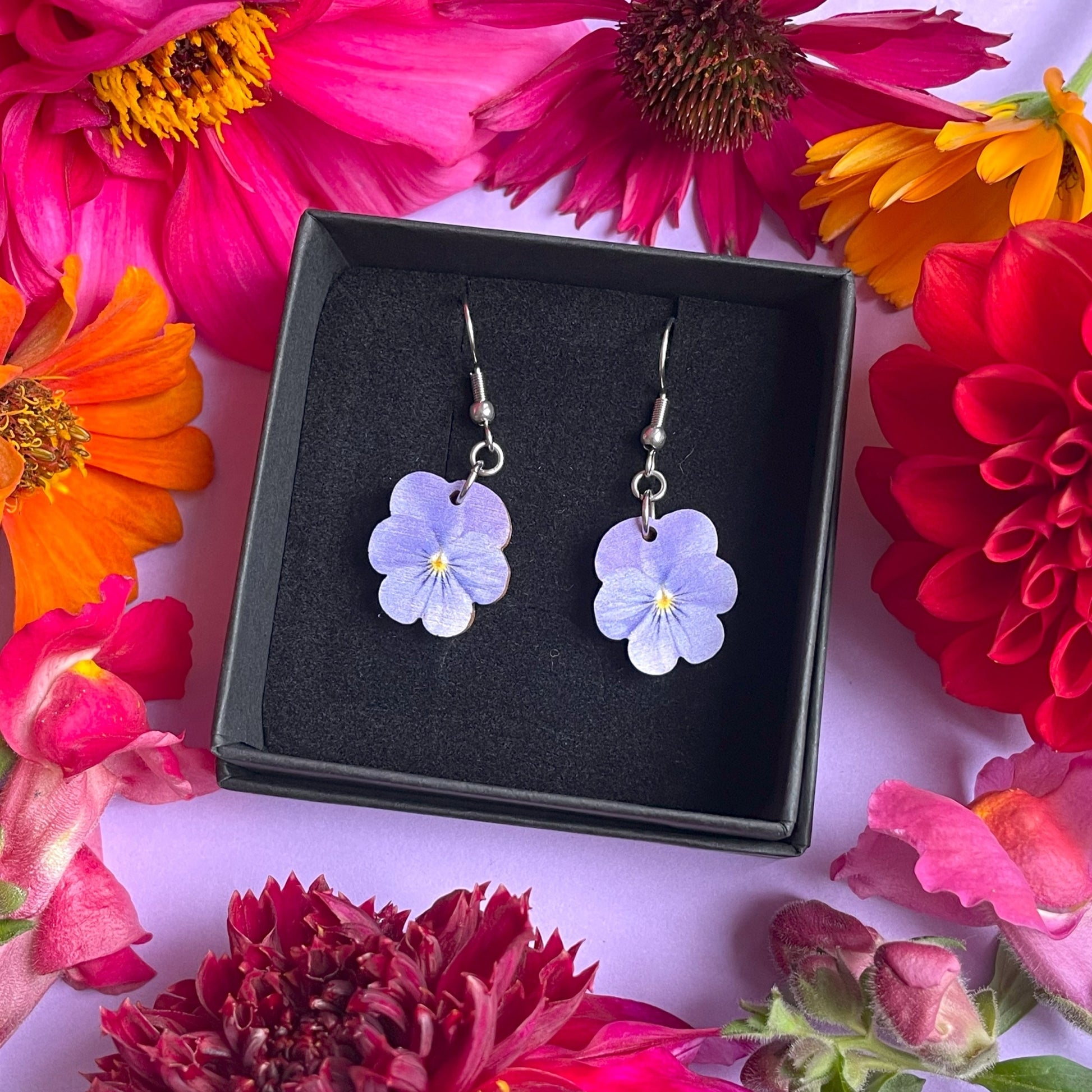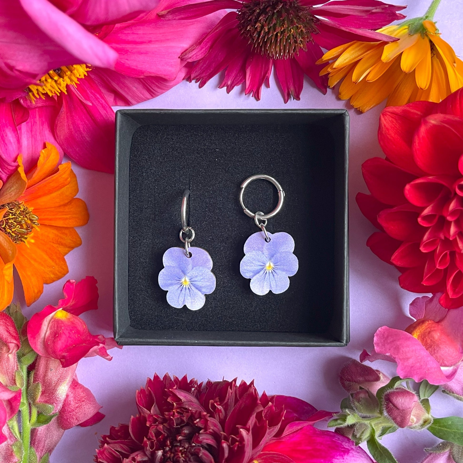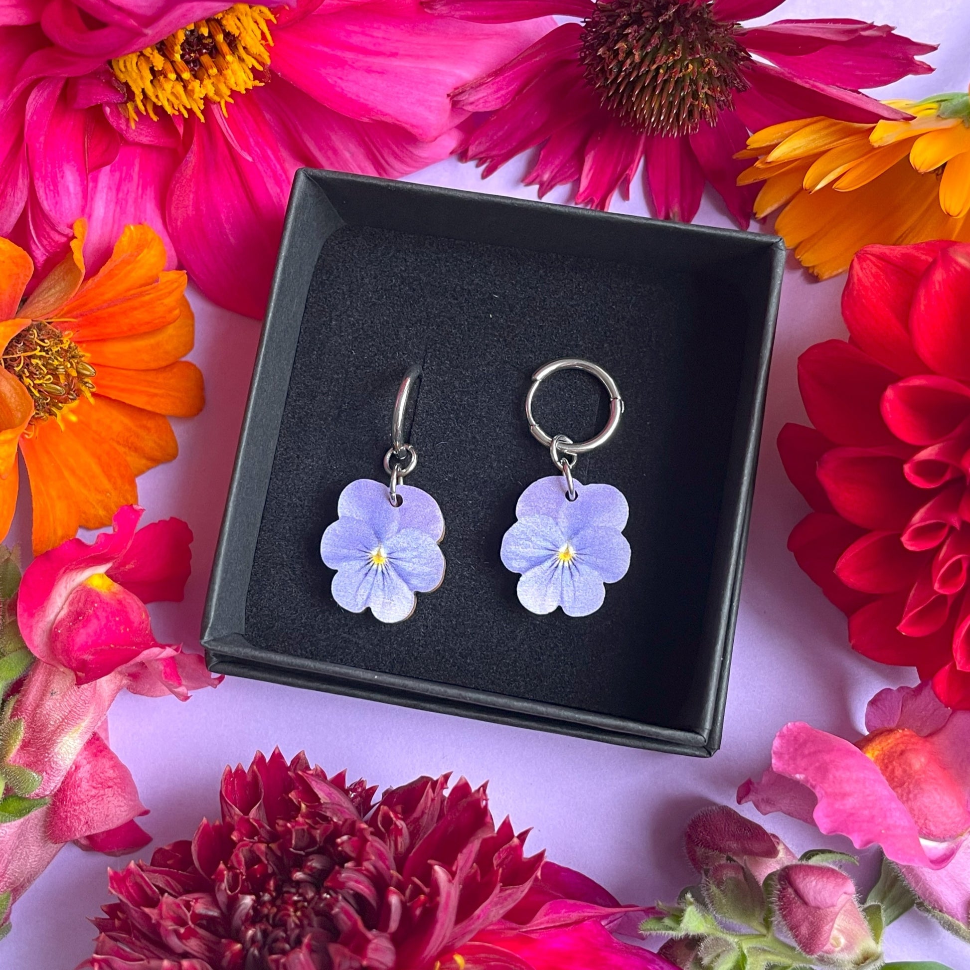Hurmaava laventelinsininen orvokki minikoossa on Inxin syysuutuus! Voit valita korvakorujen kiinnitykseksi tavallisen koukun tai huggie-renkaan.