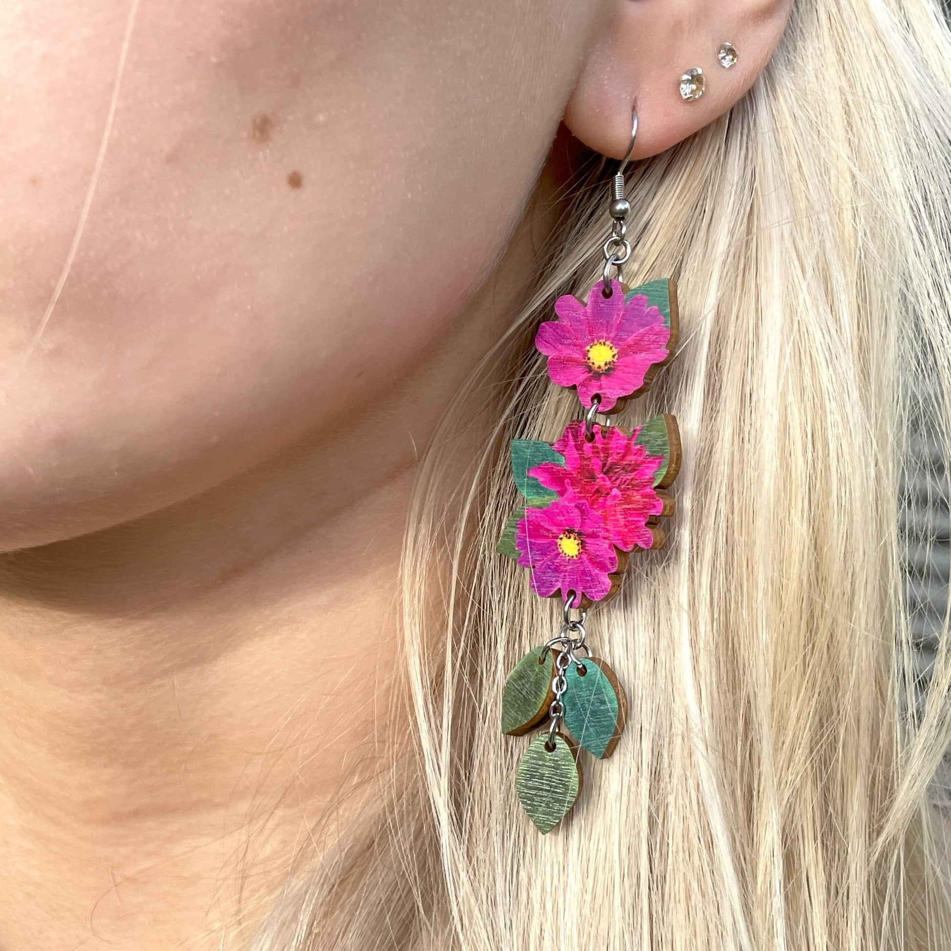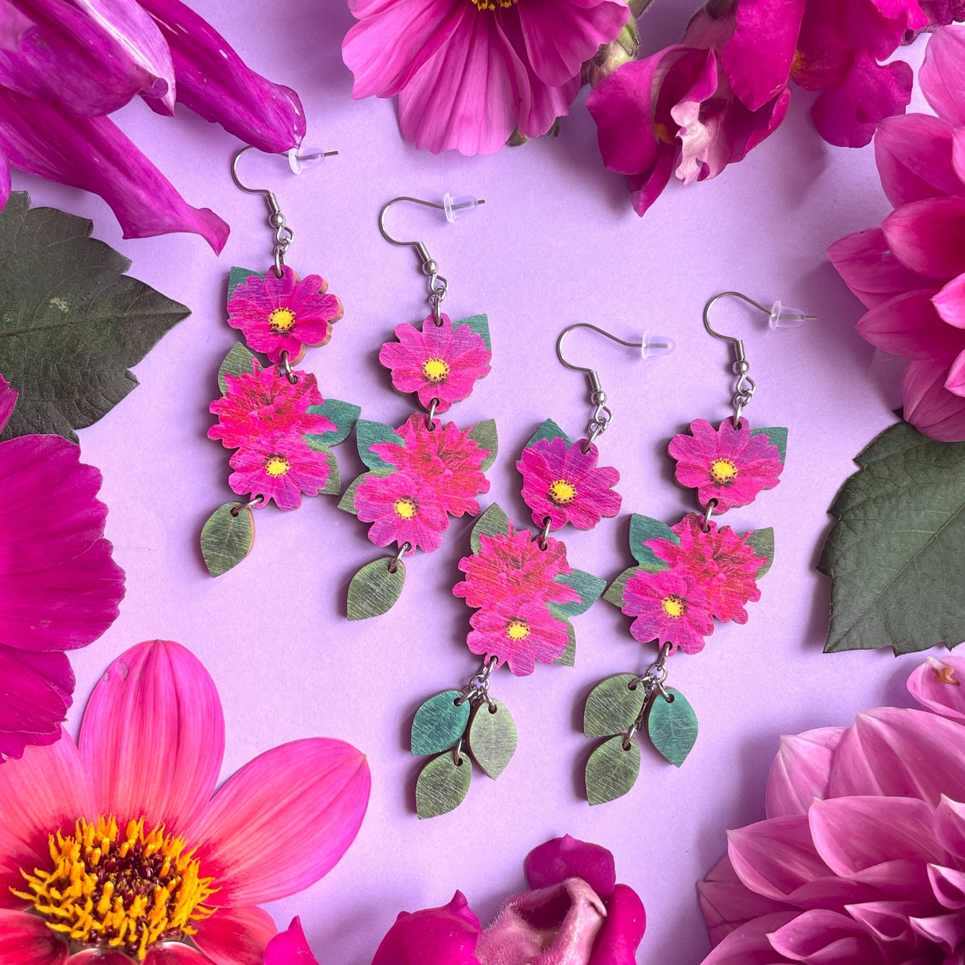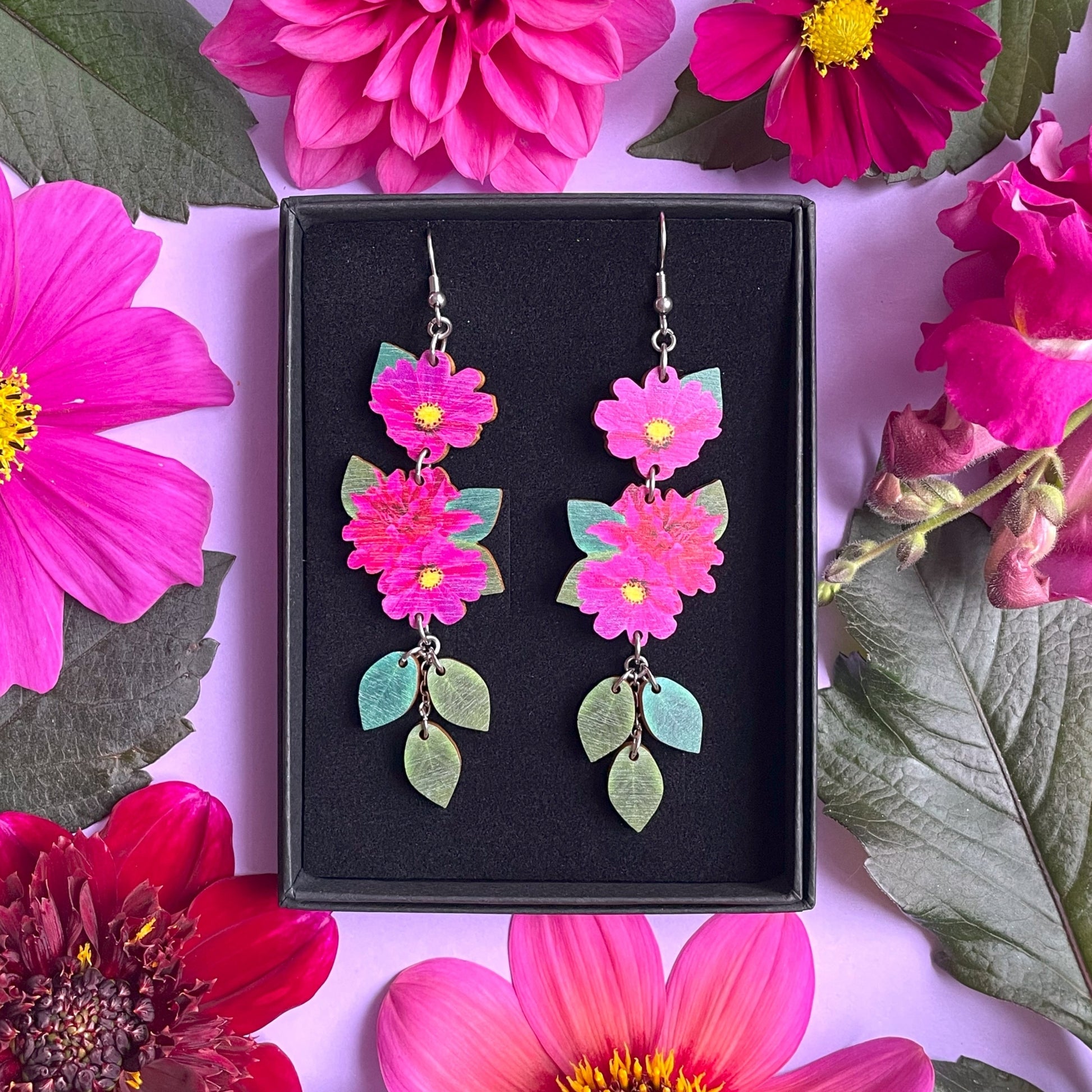 Astu esiin kuin Primadonna ja anna syksyn hehkua korvissasi! Primadonna-korvakoruissa kukkivat intensiivisen fuksian väriset daaliat ja kosmoskukat. Syksyn viimeiset kukat ovat puhjenneet ainutlaatuiseen loistoonsa.