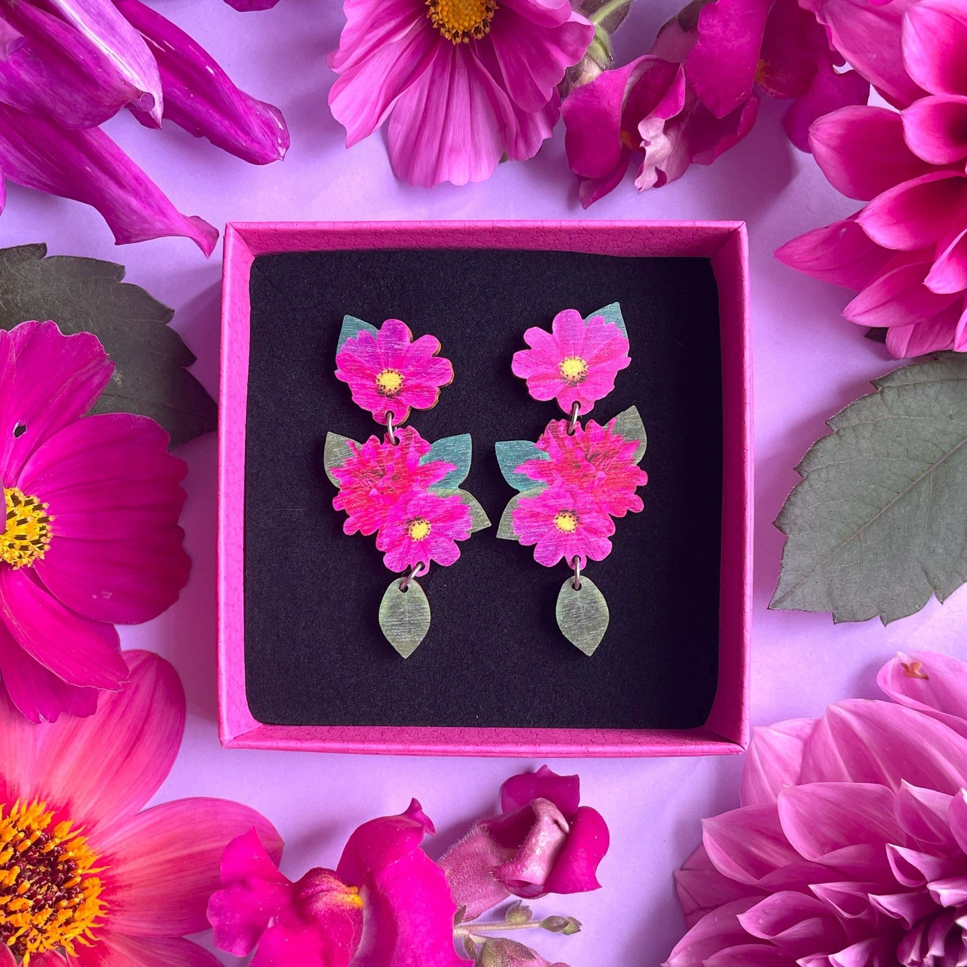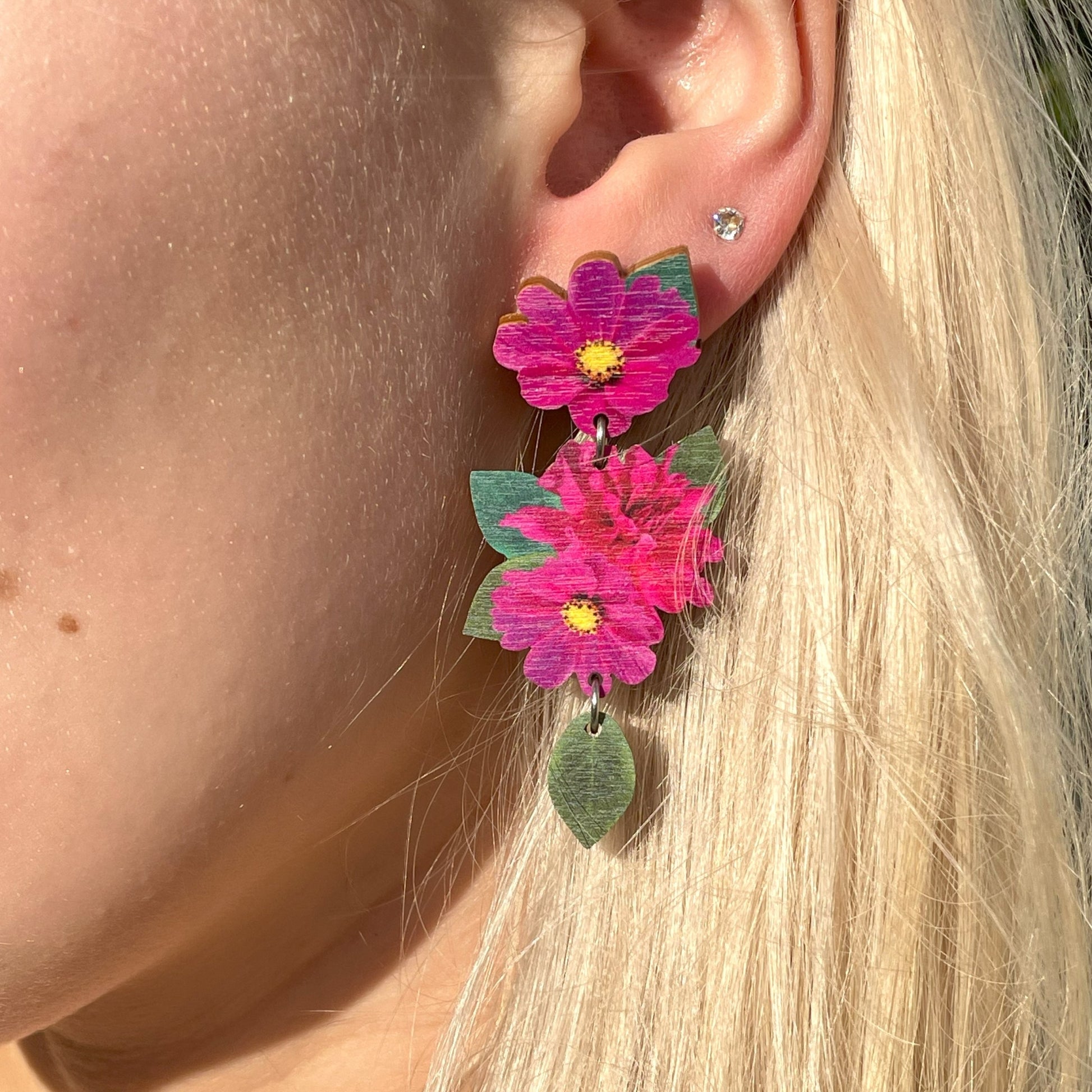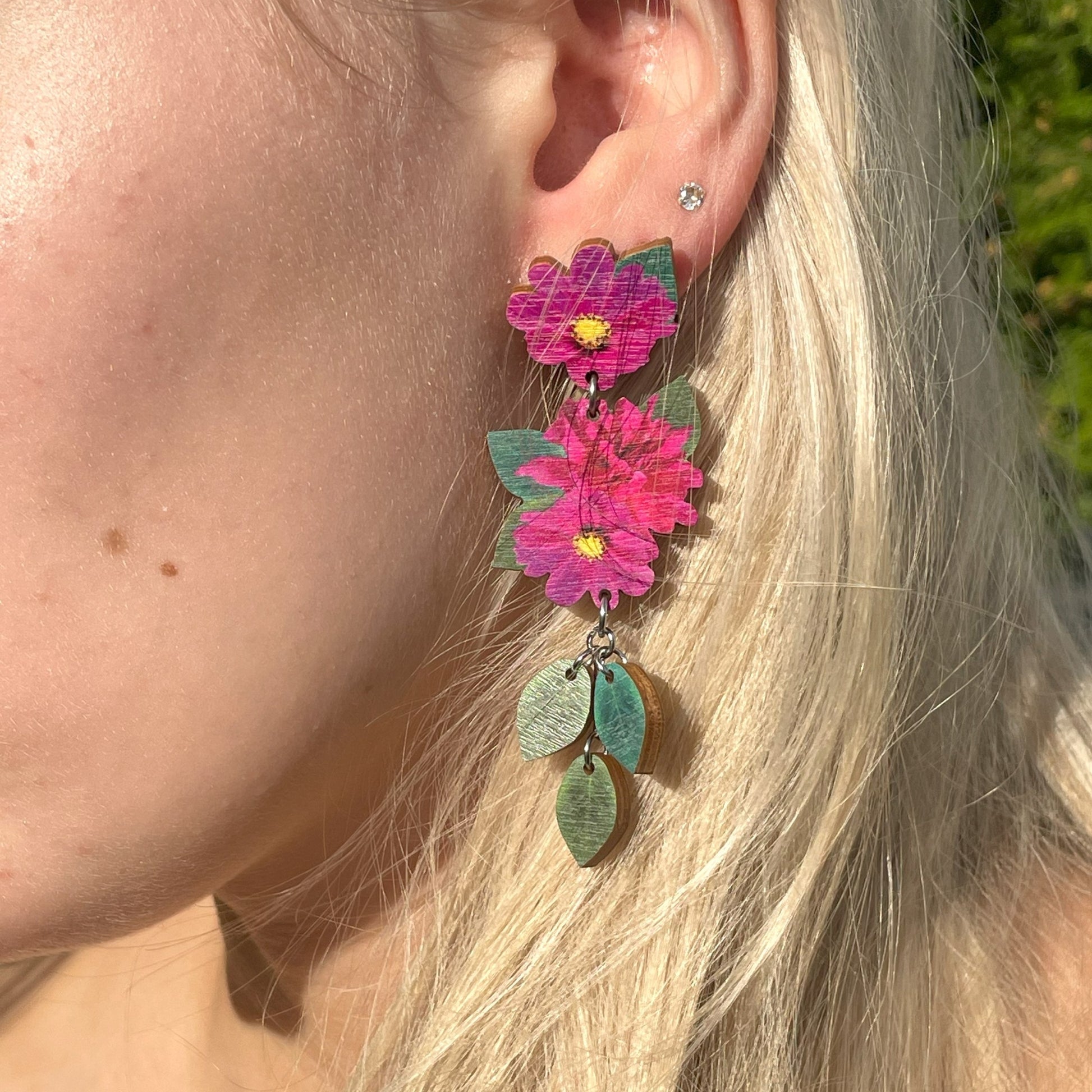 Astu esiin kuin Primadonna ja anna syksyn hehkua korvissasi! Primadonna-korvakoruissa kukkivat intensiivisen fuksian väriset daaliat ja kosmoskukat. Syksyn viimeiset kukat ovat puhjenneet ainutlaatuiseen loistoonsa.