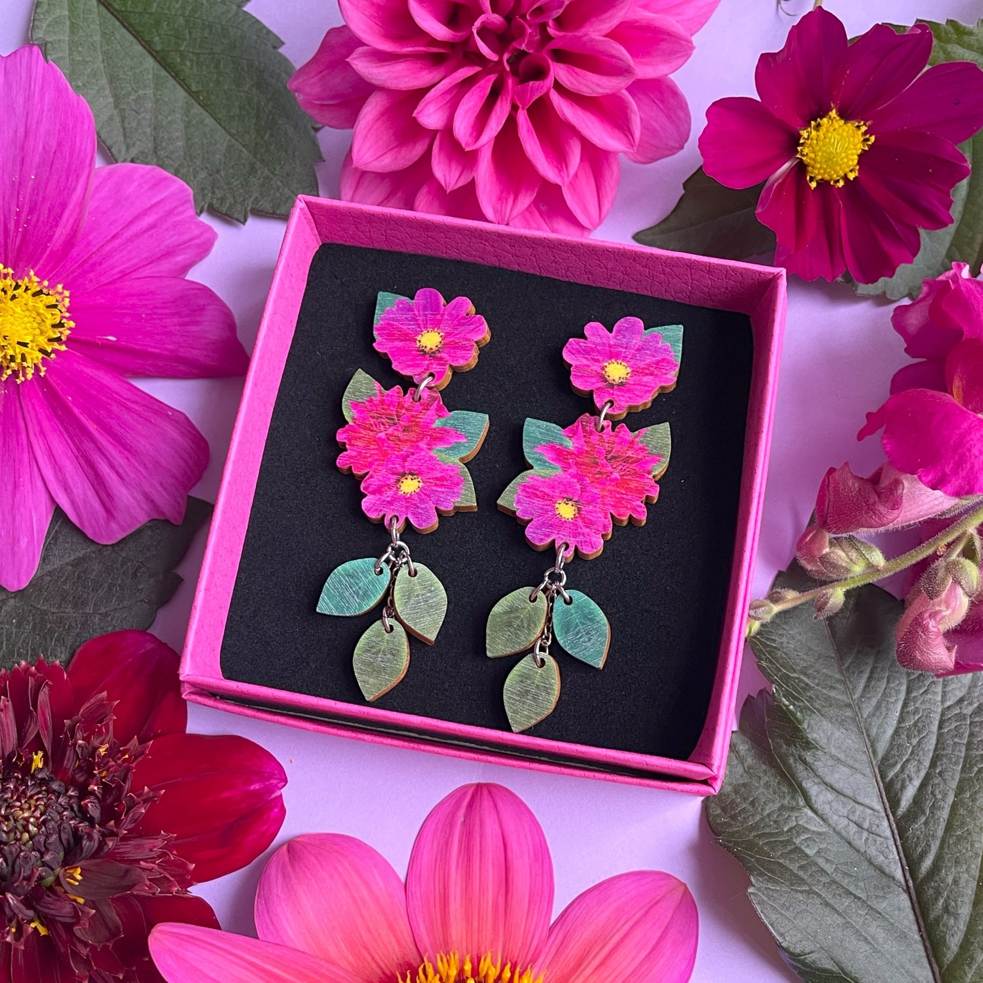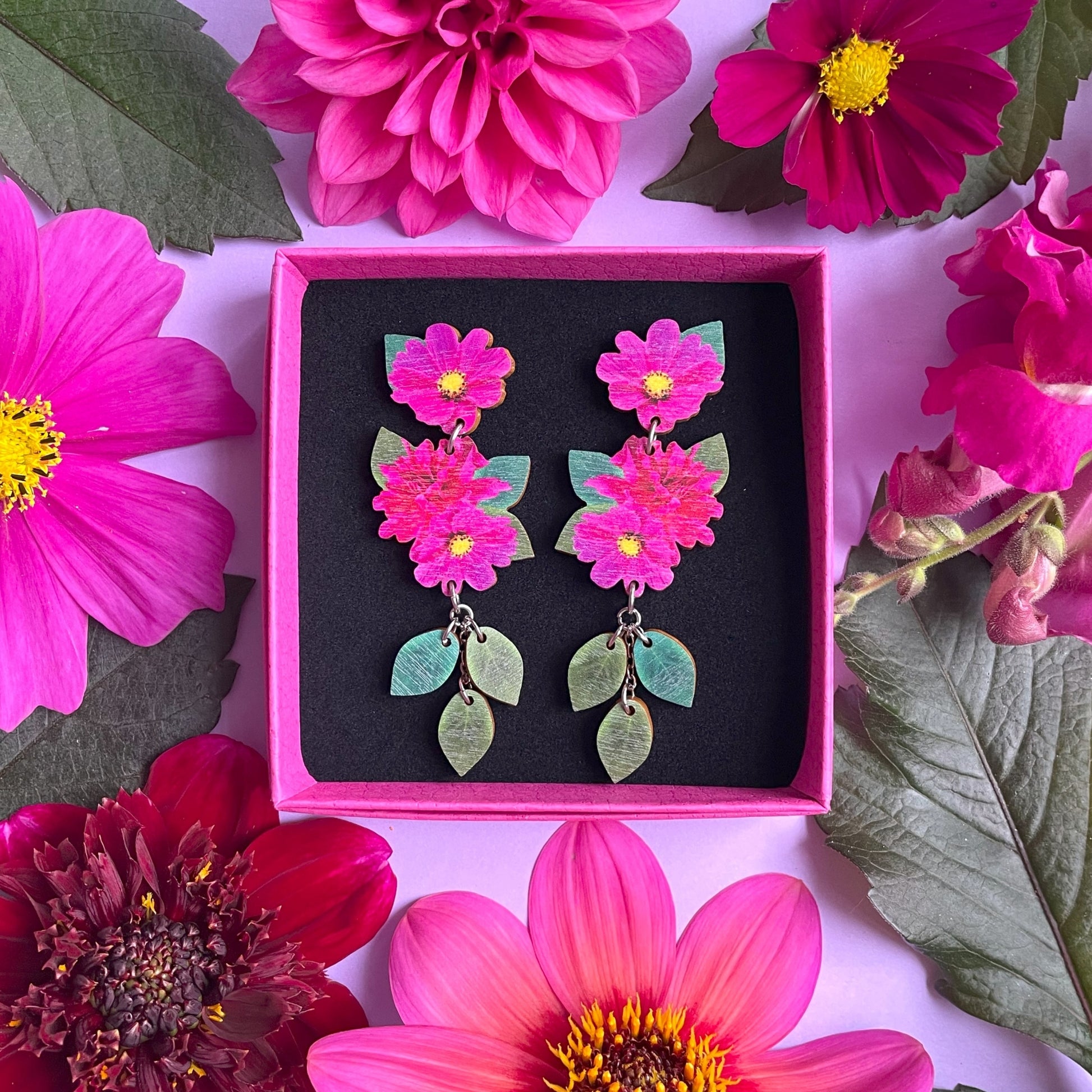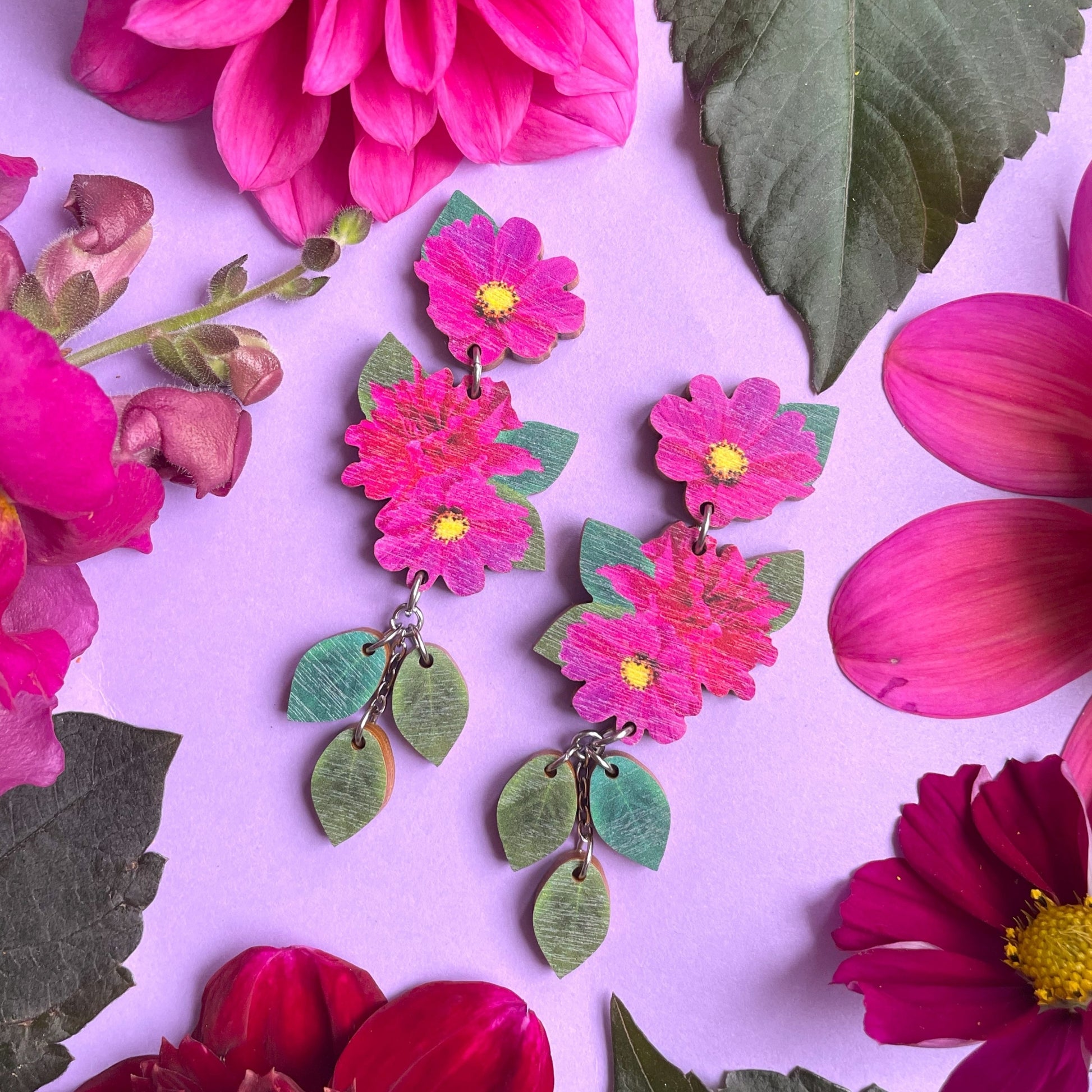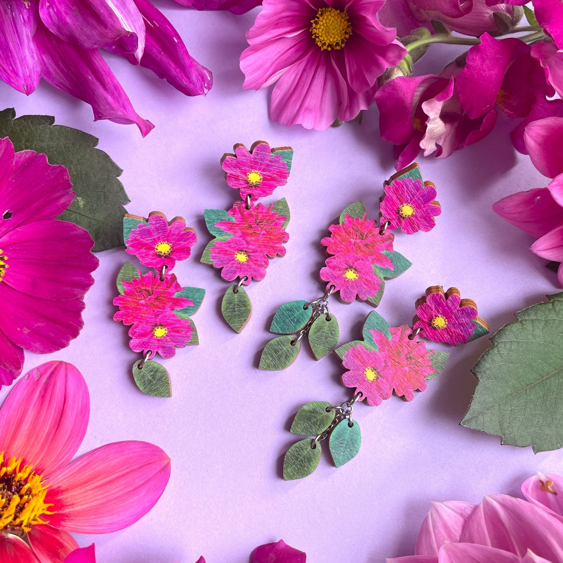 Astu esiin kuin Primadonna ja anna syksyn hehkua korvissasi! Primadonna-korvakoruissa kukkivat intensiivisen fuksian väriset daaliat ja kosmoskukat. Syksyn viimeiset kukat ovat puhjenneet ainutlaatuiseen loistoonsa.