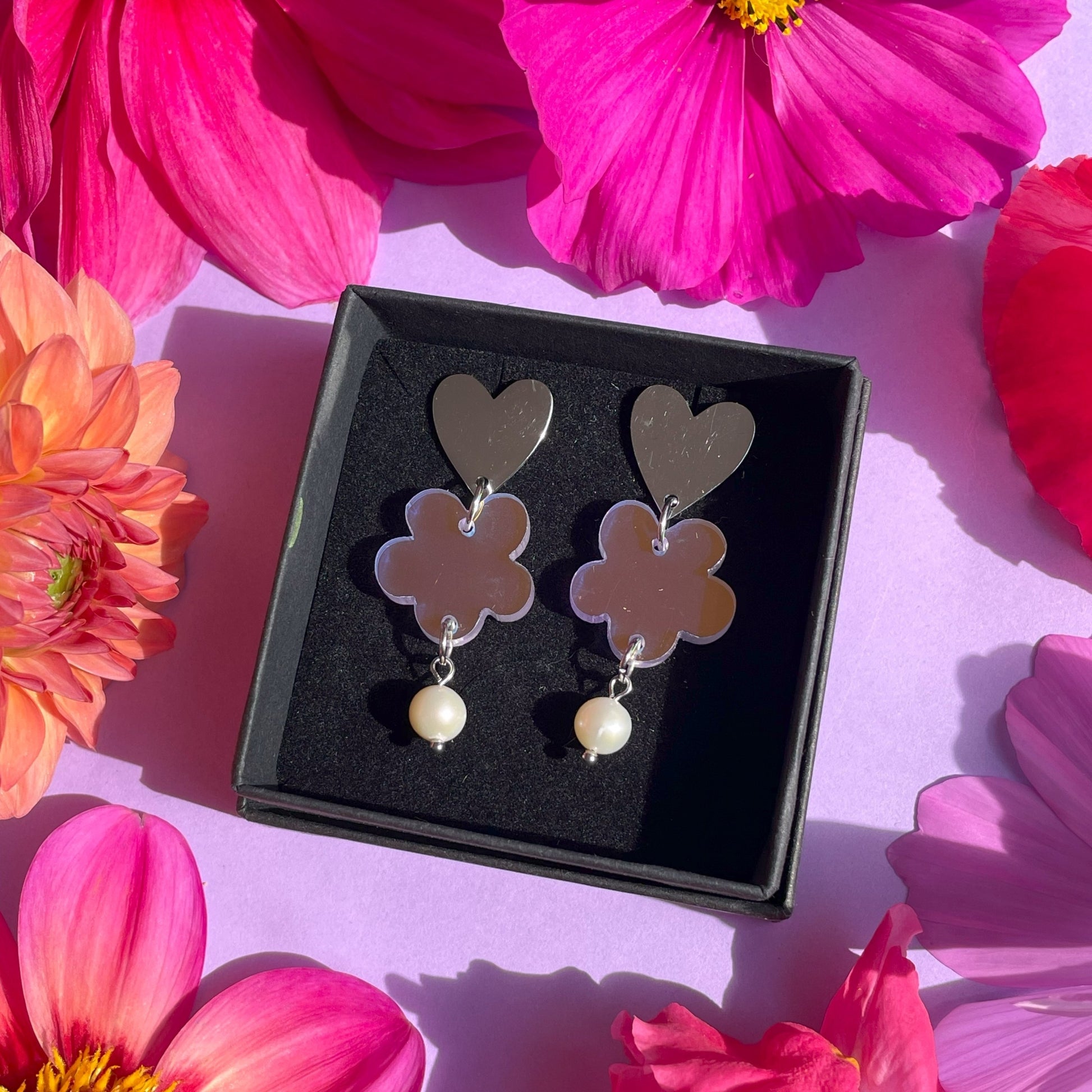 Söpöset akryylikorvakorut sydämenmuotoisella tappikiinnityksellä. Kukan materiaali on glitter- tai peiliakryyli ja kaikki metalliosat ovat kirurginterästä. Koristeena roikkuu makeanvedenhelmi. Sydäntapin leveys on 1,6 cm ja koko korvakorun pituus on tappi mukaan laskettuna on yht. 4,7 cm. Puethan akryylikorut viimeisenä mahdollisten hiuslakkojen ja tuoksujen jälkeen, jotta korun pinta pysyy siistinä. Puhdistus kostealla liinalla.
