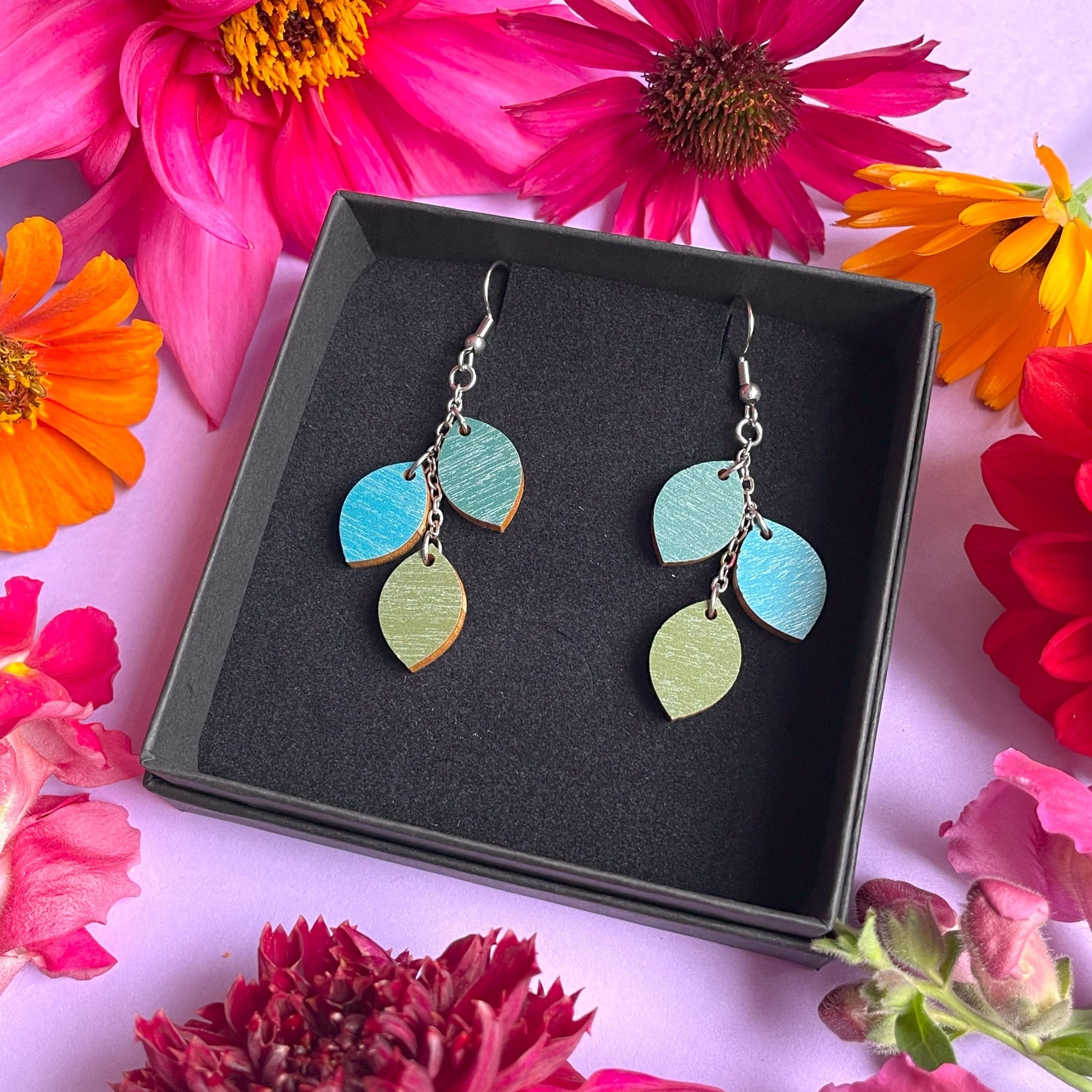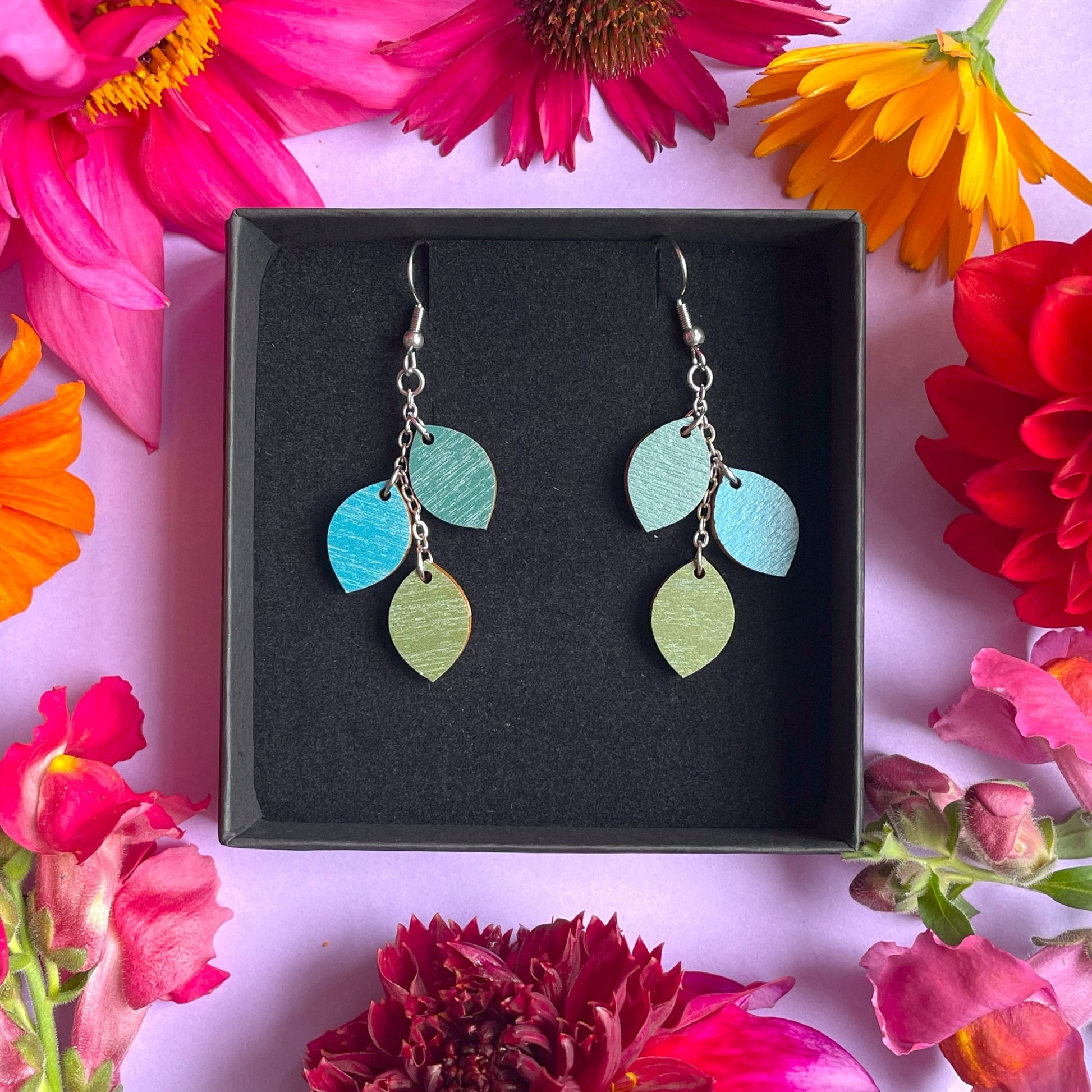 Materiaali on suomalaista PEFC- ja FSC- sertifioitua koivuvaneria ja metalliosat kirurginterästä. Puuosat on laserleikattu ja printattu (väri molemmin puolin) Helsingissä ja koottu muotoonsa Vantaalla. Korvakorujen pituus koukku mukaan laskettuna on 6,1 cm. Toimitetaan korurasiassa tai taustapahvissa valintasi mukaan.